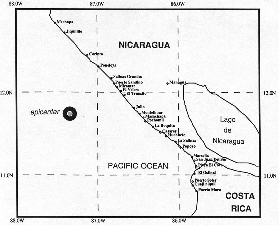 the tsunami struck along a 220 km of the Pacific coast of Nicaragua,