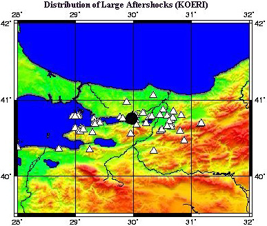 Aftershocks: Numerous aftershocks with magnitude above 4 were recorded after the main earthquake. The first of the aftershocks (magnitude of 4.6) occurred 20minutes later. Several others followed in subsequent days. Several days later, on 31 August , a strong aftershock killed one person, injured about 166 others and knocked down some of the buildings that were already weakened by the 17 August main quake. According to the USGS and Kandilli most of the aftershock activity was confined to the region bounded by 40.5-40.8N and 29.8-30.0E, which covers the area between Izmit and Adapazari to the east of the epicenter. However there was a clusters of aftershocks near Akyazi and near Izmit.