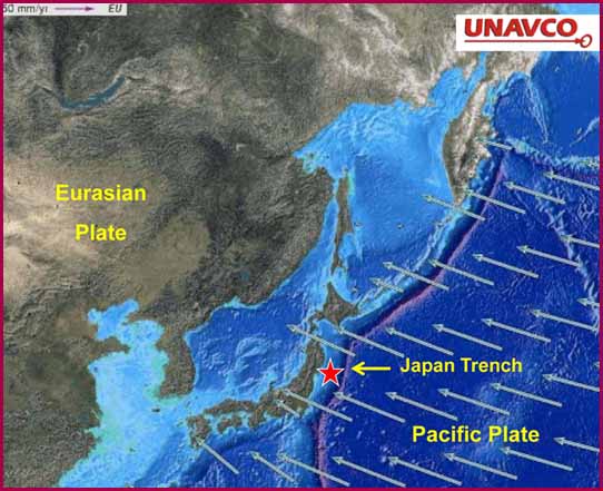 Graphic showing the directivity of Pacific plate tectonic forces along the east coast of Japan, the Kuril Islands and Kamchtaka (Modified after UNAVCO)
