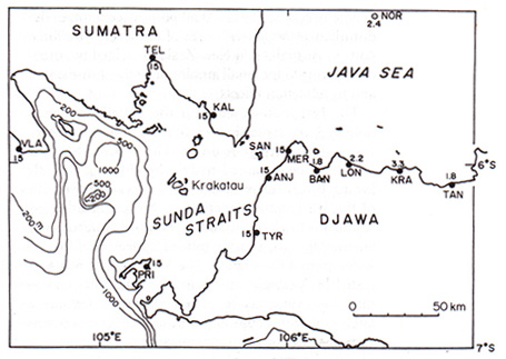Figure 3. Map showing the remnant of Rakata Island (now called Krakatau Island) after the 1983 explosion and collapse and the new volcano of Anak Krakatau that subsequently emerged from Krakatau's sunken caldera (Modified after Simkin and Fiske, 1983)Also, the final collapse of a still standing wall of Krakatau which occurred several hours later at 16:38, must have generated additional tsunami waves of short wavelegth and period also indistinguishable from the earlier major destructive tsunami. Given the catastrophic magnitude of the earlier tsunami waves that followed the 10:02 explosion, waves generated by both earlier and subsequent events were not noticed. The only tide gauge that operated in Batavia was too far to record these smaller tsunamis as separate discreet events. The small sea level disturbances that are evident on the earlier Batavia tide gauge record may have been caused by the atmospheric shock waves of the volcanic explosions, rather by the short period tsunami waves which were probably filtered out.
