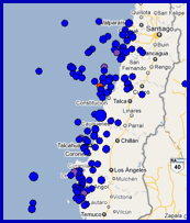 Date and Origin Time - February 27, 2010; at 06:34:14 GMT; 1:34 a.m. EST, 3:34 a.m. (local time). Epicenter - 35.909 S, 72.733 W offshore from Maule, Chile; 99 km (61 miles) of Talca; 117 km (73 miles) of Concepcion; ; 317 km (197 miles) of Santiago (USGS). Focal depth - 35 km (21.7 miles). Aftershocks - In 2 1/2 hours following the 90-second main shock, the USGS reported 11 aftershocks, of which five measured 6.0 or above.Up to March 1, a total of 121 aftershocks with magnitude 5.0 or greater were recorded (USGS NEIC). Eight of these had magnitudes of 6.0 or greater and one had magnitude 6.9. Rupture - About 550 km long, extending to about 50 km in depth below the earth's surface. Ground Motions - Ground motions of the main shock reportedly lasted for about 90 seconds.