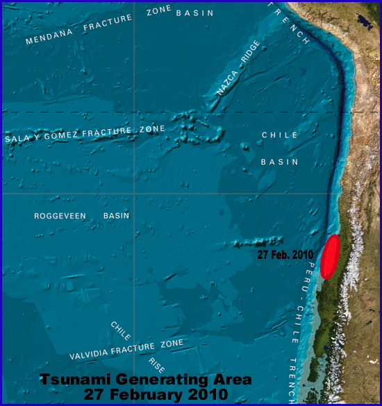 Tsunamigenic Area - A review of IRIS broadband data the earthquake aftershock distribution and of the moment tensor analysis of the February 27, 2010 earthquake indicate a general trend striking at 180 with a dip of 180. and a slip of almost 10 meters on the fault plane. The total rupture was about 550 km long, more than 100 km wide and extended to about 50 km in depth. Fig. 5 shows the approximate dimensions and orientation of the tsunamigenic area. It paralleled the coast of Chile and affected an area of about 82,500 square kms.