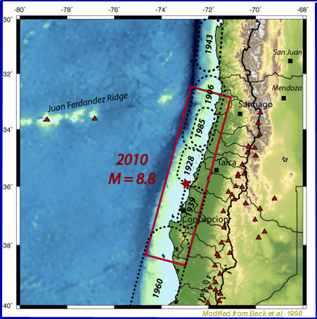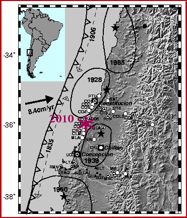 Closing of Seismic Gap - The region south of Valparaiso from about 34º to 36º South had been identified as a moderate seismic gap because it has not ruptured since1835 (Barrientos, 1987; Campos et al., 2002). The quake relieved stress by rupturing this seismic gap segment of the South American subduction zone, which separated the source regions of the great earthquakes of 1960 and 1906. However the area affected included portions of both the 1960 and 1906 events.