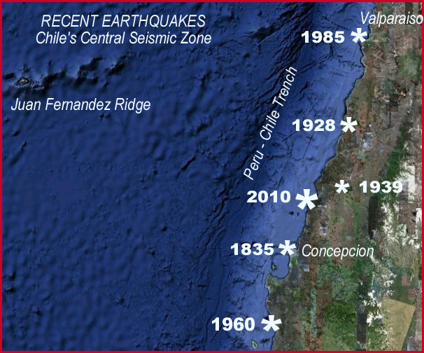 The 2010 earthquake involved thrust faulting in the coastal segment of Chile's central seismic zone, where similar anomalies are evident. As mentioned, the region south of Valparaiso from about 34º to 36º South had been identified as a moderate seismic gap where no great earthquake had occurred for many years. With the exception of a 1939 earthquake - inland and deeper - there had been no major or great earthquake in this area for about 120 years. This segment was highly stressed because of the active and oblique subduction of Nazca tectonic plate below South America at high rate of 6.8 cms/yr. The February 27, 2010 earthquake closed the gap.