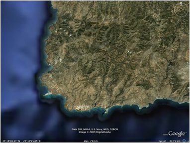 Figure 7. Google imagery of Southwestern Crete shows an arcuate subsidence of a large landmass on the southwestern end of the island.
