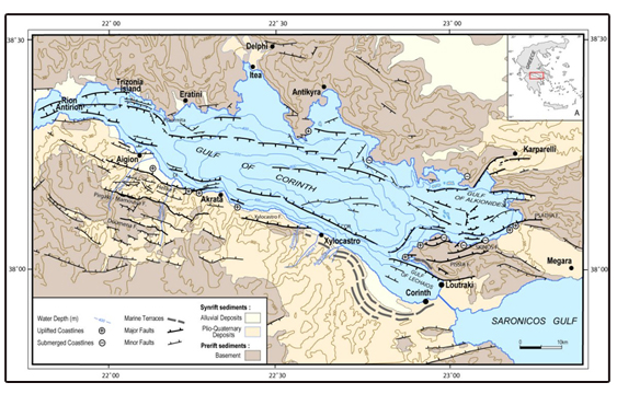 Figure 10. Major faults along the Gulf of Corinth. The lost Ancient Elike was east of the present city of Aigion, along a zone of parallel faults on land and at sea that have generated destructive local tsunamis.